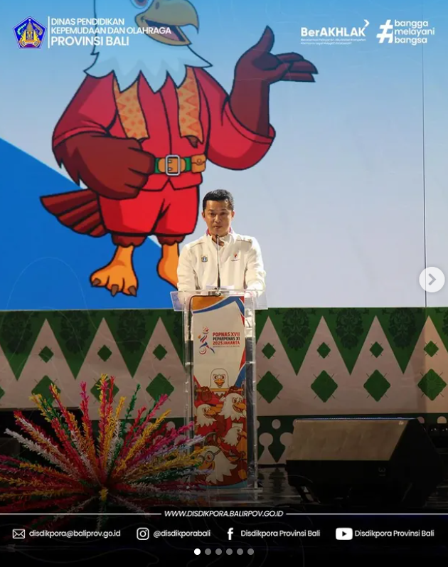 Kabid Pemuda dan Olahraga Provinsi Bali, Putu Bayu Putra Mahendra, S.STP., M.Si bersama tim Perwakilan dari Dinas Pendidikan Kepemudaan dan Olahraga Provinsi Bali turut serta mendampingi para Atlet serta Pelatih Perwakilan Provinsi Bali dalam Acara Pembukaan Pekan Olahraga Pelajar Nasional (POPNAS) XVII dan Pekan Paralimpik Pelajar Nasional (PEPARPENAS) XI. Khusus Provinsi Bali, keikutsertaan pada Ajang POPNAS XVII diikuti oleh 198 Atlet yang akan berlaga di 20 cabang olahraga dan keikutsertaan pada Ajang PEPARPENAS XI diikuti oleh 21 Atlet yang akan berlaga pada 4 Cabang Olahraga.