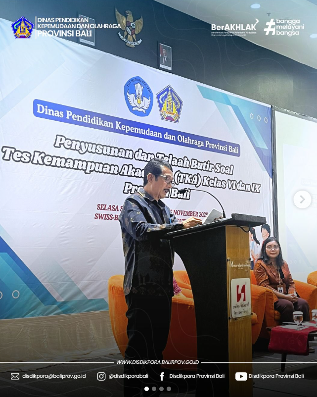 Kepala Dinas Pendidikan Kepemudaan dan Olahraga Provinsi Bali Dr. KN. Boy Jayawibawa, didampingi Plt. Sekretaris Dinas Luh Made Serianingsih, S.Kom.,M.AP serta jajaran Kepala Bidang di lingkungan Dinas Pendidikan Kepemudaan dan Olahraga Provinsi Bali, menghadiri dan membuka secara resmi kegiatan Penyusunan dan Telaah Soal Tes Kemampuan Akademik (TKA) Kelas 6 dan 9 Tahun 2025.