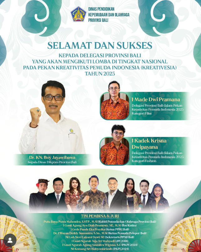 Selamat dan Sukses kepada Delegasi Provinsi Bali Yang Akan Mengikuti Lomba di Tingkat Nasional Pada Pekan Kreativitas Pemuda Indonesia (Kreativesia) Tahun 2025 atas nama I Made Dwi Pramana ” Delegasi Provinsi Bali dalam Pekan Kreativitas Pemuda Indonesia 2025 Kategori Film” dan I Kadek Krisna Dwipayana ” Delegasi Provinsi Bali dalam Pekan Kreativitas Pemuda Indonesia 2025 Katagori Fashion”