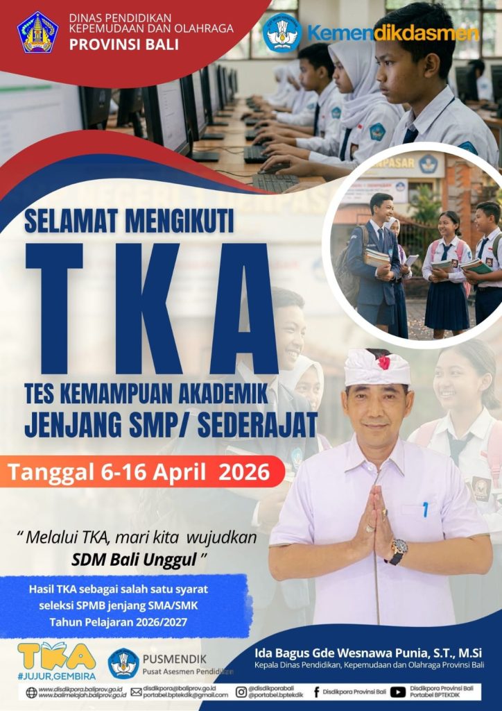 Untuk mendukung program SDM Bali Unggul di Provinsi Bali, hasil TKA jenjang SMP/sederajat nantinya digunakan sebagai salah satu persyaratan dalam pelaksanaan SPMB jenjang SMA/SMK Tahun Pelajaran 2026/2027. #TKA JujurGembira#SDMBaliUnggul
